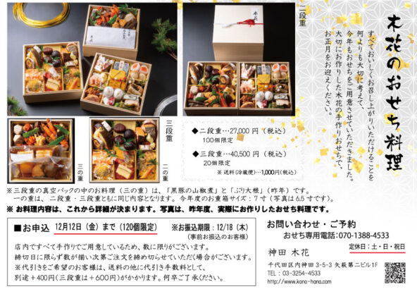 | 電話番号 | おせち専用電話 070-1388-4533 電話受付時間 12:00〜23:00 ※日曜日 定休 店舗電話番号 03-3254-4533 |
